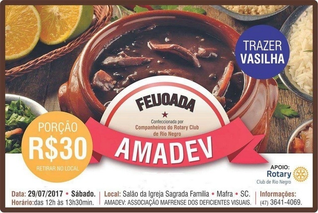 A Associação Mafrense de Deficientes Visuais – AMADEV - promove neste sábado, 29 de julho, uma feijoada em prol da própria associação. Os companheiros do Rotary Clube de Rio Negro serão os responsáveis pela confecção do prato. A porção completa custa R$ 30,00 e deve ser retirada no local – Salão da Igreja Sagrada Família – das 12 às 13h30. Mais informações podem ser obtidas pelo telefone 3642-7037ou na sede da associação que fica na Rua Getúlio Vargas, 175.