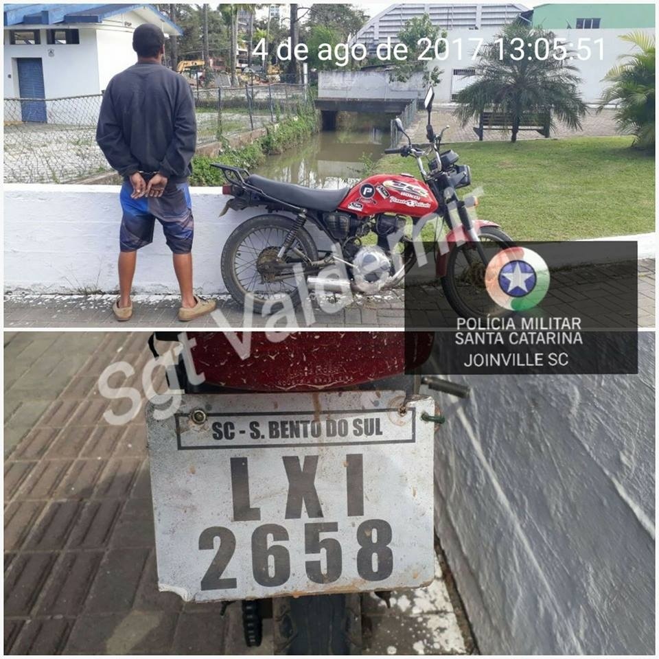 Policiais Militares do 8°BPM em rondas pela pela Avenida Albano Schultz, centro Joinville e visualizam condutor transitando com motocicleta em atitude suspeita.