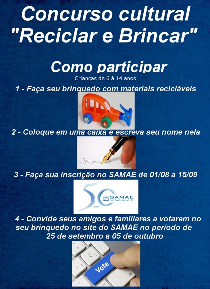 “Reciclar e Brincar”. Este é o tema do 1º Concurso Cultural de Criação de Brinquedos com Material Reciclável, promovido pelo Samae. Podem participar, crianças de 6 a 14 anos, moradores de São Bento do Sul.