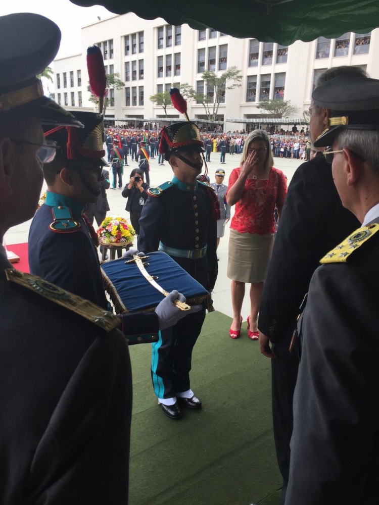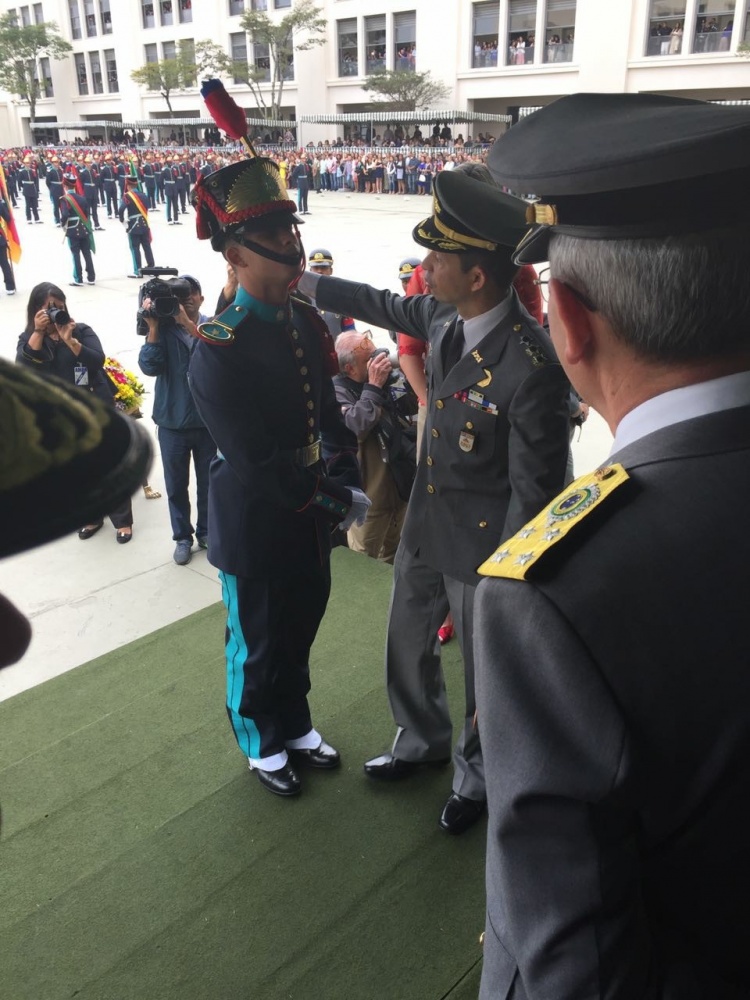 O Cadete Lucca Torres, primeiro colocado do Curso Básico, recebeu a miniatura do sabre invicto de Caxias das mãos do Ministro da Defesa, Raul Jungmann. O Cadete Lucca Torres é filho do Tenente Coronel Jackson Rodrigues de Sousa Junior, Comandante do 5º Regimento de Carros de Combate, e já se destacou na Escola Preparatória de Cadetes, em Campinas-SP, quando recebeu o Estandarte Histórico.