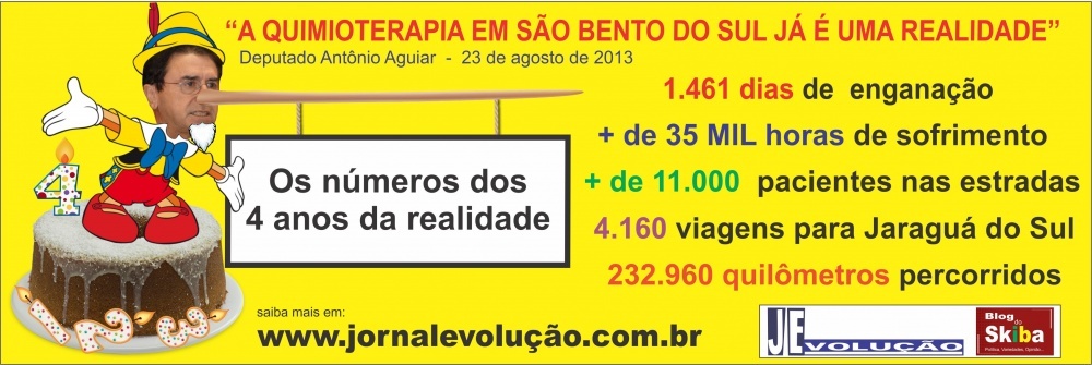 Pois bem, nunca deixou de cobrar a farsa montada pelo doutor Aguiar, a mentira deslavada quando afirmou ser meio seu parente e que a QUIMIOTERAPIA sequer dependia de autorização dos governos estadual e federal. Pois bem. “A data de hoje (23-08-2017) marca quatro (4) anos da “REALIDADE” mentirosa e ainda nossos pacientes continuam sendo atendidos em Jaraguá do Sul, conforme demonstro e comprovo com os números e outdoor espalhados pela cidade. Triste e lamentável saber que o senhor deputado Aguiar ainda continua no poder através da mentira, enganação e promessa, aliás promessa aqui não cabe, ele afirmou que já era REALIDADE”, declara.