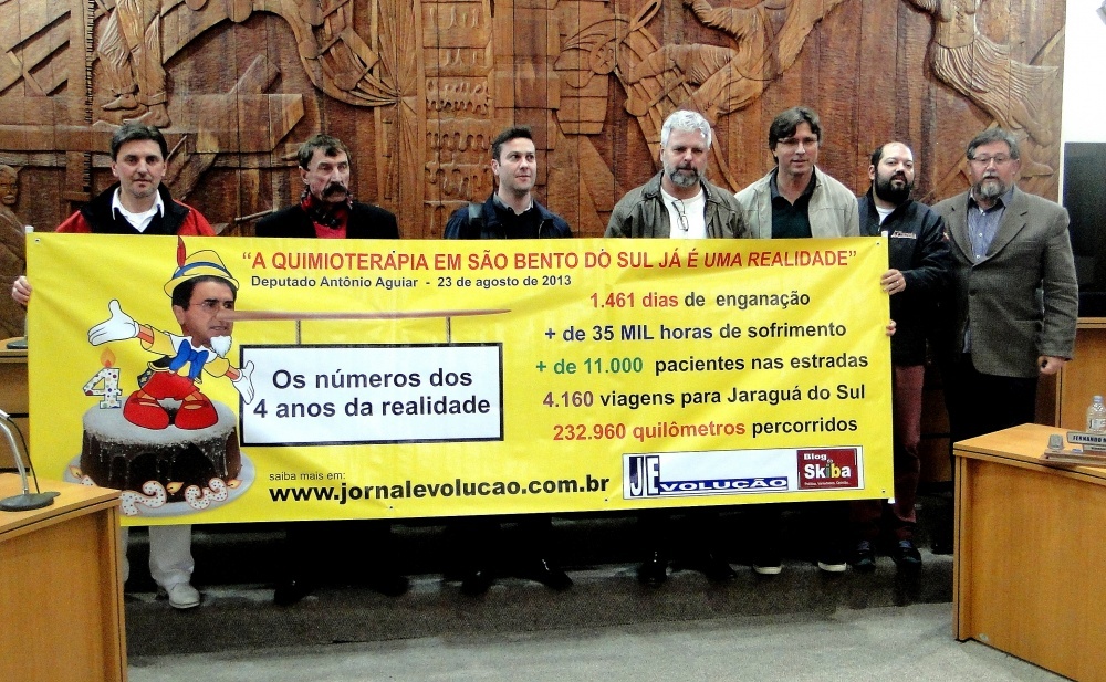 A iniciativa foi do vereador Fernando Mallon que havia perdido sua esposa recentemente vítima de câncer. Ele convidou o jornalista Pedro Alberto Skiba para ajudá-lo na iniciativa, o qual se envolveu de imediato. Mesa formada, prefeitos de Campo Alegre, São Bento do Sul e Rio Negrinho. Deputado estadual Silvio Dreveck, médico responsável pela unidade oncológica de Jaraguá do Sul, presidente da Câmara de Vereadores. Eis que chega aquele que passou a ser idolatrado e a principal figura da noite e que continua no seu "reino encantado da mentira". Foram vários os pronunciamentos e promessas de empenho pela causa. Para felicidade de todos, eis que o último pronunciamento e a notícia bombástica que mereceu aplausos em pé e lágrimas emocionadas foi feita pelo deputado estadual ANTONIO MAURO AGUIAR(PMDB). Ele a tinha mantido em sigilo até para seus correligionários e que foi usada como arma politiqueira e rasteira: "A QUIMIOTERAPIA EM SÃO BENTO DO SUL JÁ É UMA REALIDADE". Um histerismo coletivo. Skiba, não resistiu. Saiu da sala de imprensa pediu o microfone e em pé diante da mesa principal de viva voz chamou o deputado de mentiroso.