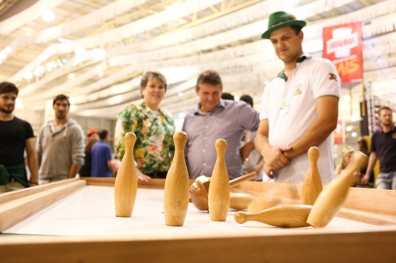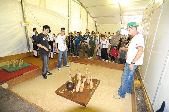 Uma versão menor do já famoso jogo de bolão tão comum em Santa Catarina. O diferencial desta versão é que os pinos devem ser derrubados com um pião.