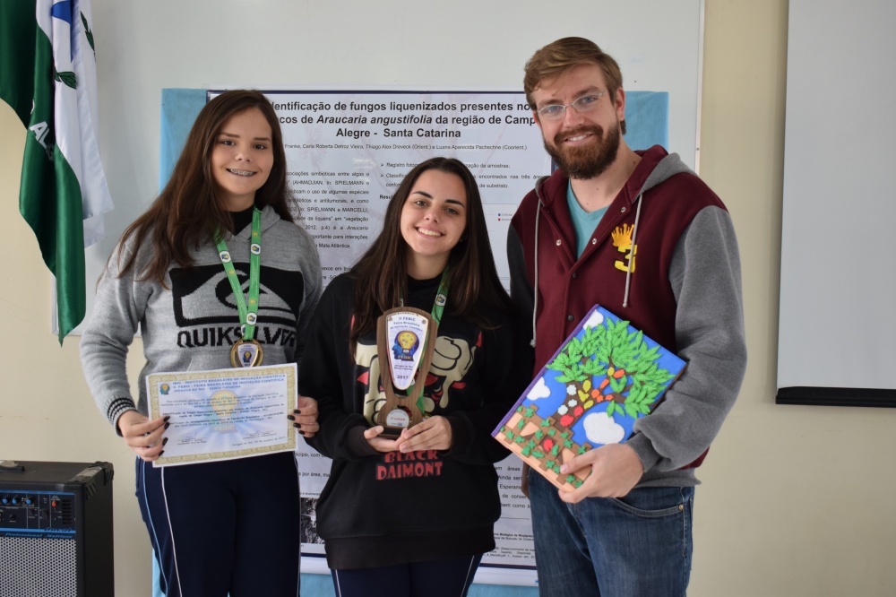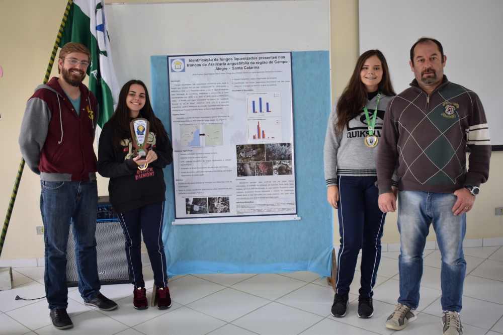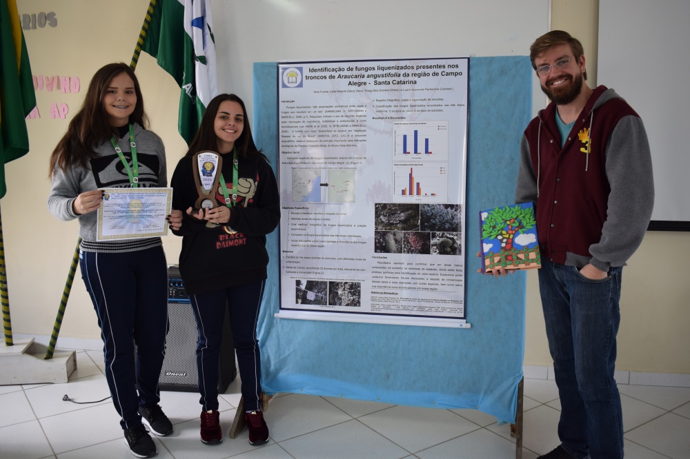 As jovens Carla Roberta Detroz Vieira e Aline Franke apresentaram o trabalho científico sobre Identificação de Fungos Liquenizados Presentes nos Troncos de Araucária Angustifolia da Região de Campo Alegre - Santa Catarina. As alunas foram acompanhadas pelos professores Thiago Alex Dreveck e Luana Aparecida Pachechne.