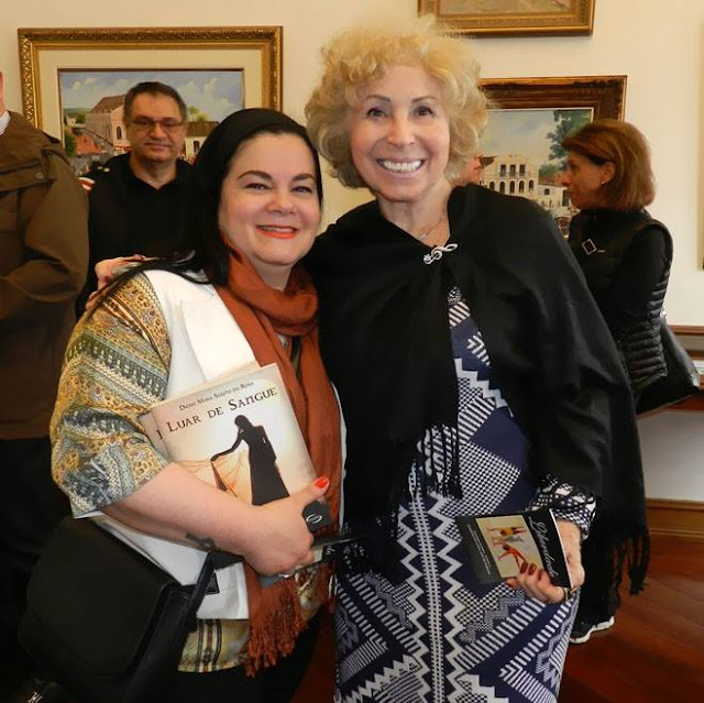 As confreiras da Academia de Letras José de Alencar, Dione Mara Souto Rosa e a escritora Noilves Araldi, para quem não existe tempo ruim e é uma fonte de energia positiva inesgotável.