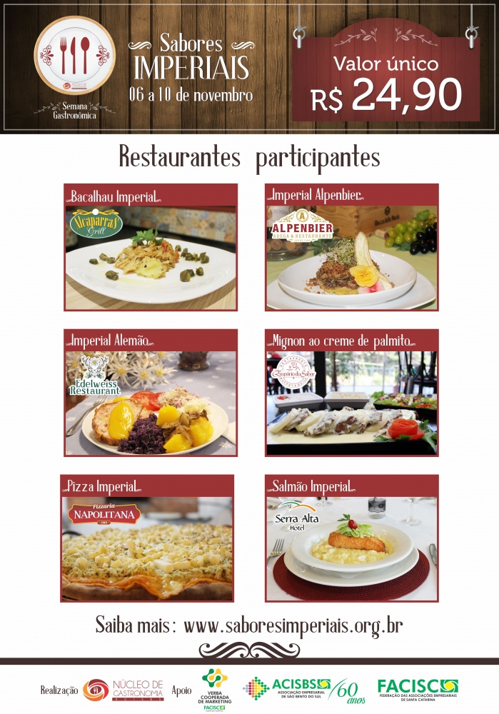 A Semana Gastronômica “Sabores Imperiais” está inserida na Semana dos Núcleos da Associação Empresarial (ACISBS), que acontece de 06 a 10 de novembro de 2017, organizada pelo Núcleo de Gastronomia. Os seis restaurantes que integram o grupo - Empório do Sabor, Alcaparras, Edelweiss Restaurant, Serra Alta Hotel, Alpenbier e Napolitana, irão oferecer pratos preparados especialmente para o período, com valor único de R$ 24,90. Na composição de cada prato foram selecionados ingredientes que remetem ao período da colonização, aliados a elementos da culinária atual.