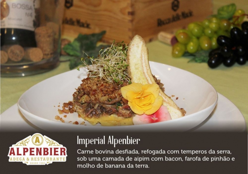 Alpenbier - Imperial Alpenbier (carne bovina desfiada, refogada com temperos da serra, sob uma cama de aipim com bacon, farofa de pinhão e molho de banana da terra);
