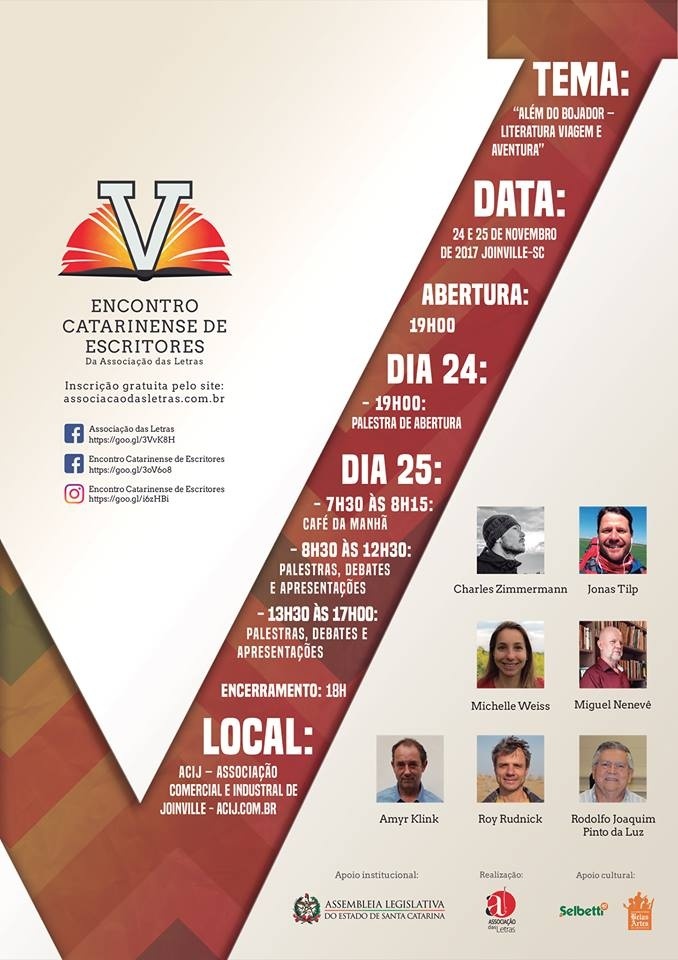 De barco a remo, veleiro, de bicicleta, de Land Rover, caminhando, destrinchando escritos, debatendo caminhos, mais de 200 escritores catarinenses e paranaenses estarão na ACIJ, em Joinville, nos dias 24 e 25 de novembro, no V Encontro Catarinense de Escritores, que tem como tema: “Além do Bojador – Literatura de Viagem e Aventura”.