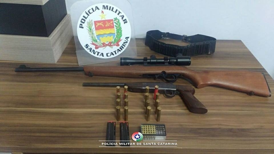 Foram realizadas buscas na residência, sendo encontradas duas espingardas de pressão, uma calibre 5.5 e outra calibre 4.5, e ainda duas armas de fogo, sendo um rifle CBC calibre .22 com luneta e um pistolete marca Boito calibre 36. Foram ainda localizadas 46 munições nos calibres das armas de fogo citadas, sendo que oito destas já estavam deflagradas.