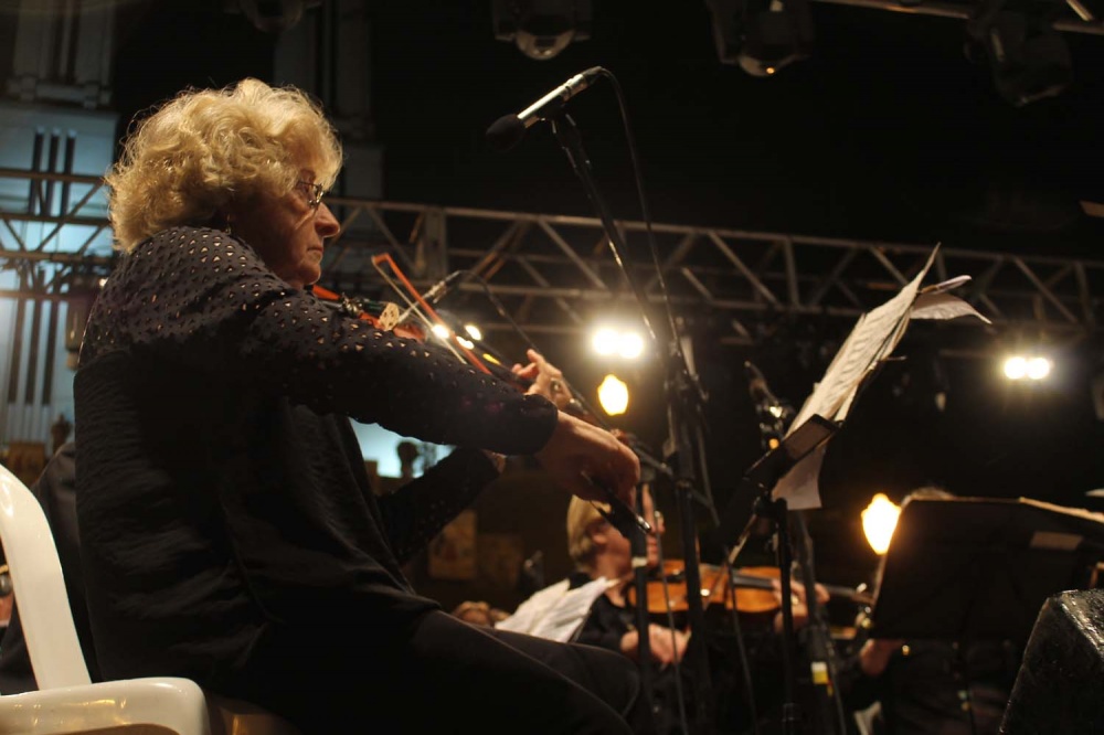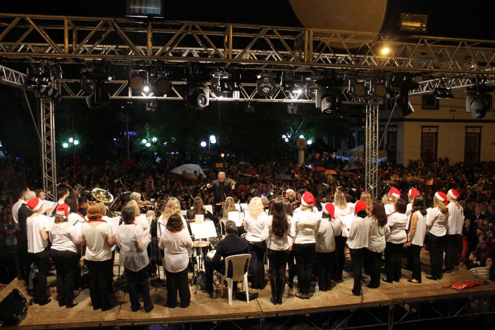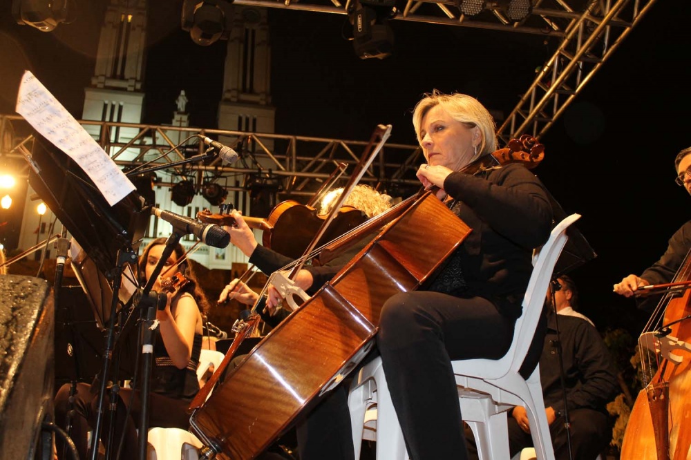 No palco instalado em frente à escadaria da Igreja Matriz Puríssimo Coração de Maria, já estavam posicionados todos os integrantes da Orquestra São Bento do Sul e coral adulto da Escola de Música Donaldo Ritzmann, sob a regência do professor Luiz Carlos Grossl.