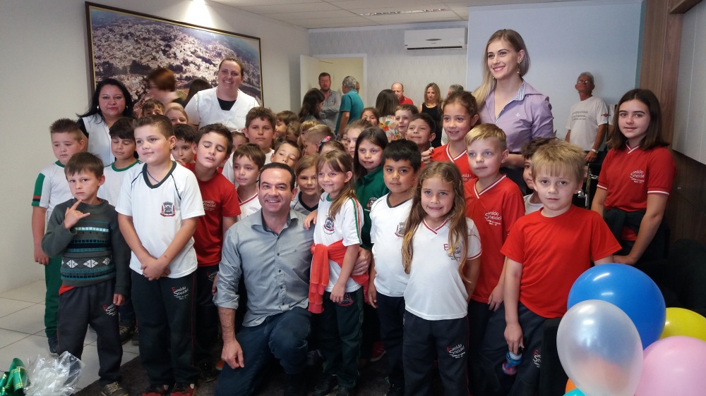 Para parabenizar o Prefeito Wellington Bielecki pela passagem de seu aniversário, na última quinta-feira, 29 de dezembro, a diretora da EMEB Evaldo Steidel, Luciana Steffens, acompanhada das professoras Carla Cristiana Herbst Bruske e Junia de Cassia Gomes, truxeram os alunos do 1º e 2º anos para cantar o “parabéns”. Dentre os presentes que o prefeito recebeu dos alunos, uma cesta de verduras colhidas na prória escola, um cartão e canções executasa pelos alunos Renan e Juliana Grochovski e Nádia Becker (no violão) e pelo representante da comunidade, Izaltino Becker (gaita). Em seguida, em coro, todos cantaram juntos o parabéns à você. O prefeito agardeceu a homenagem e disse “como é bom estar com pessoas que gostamos e com vocês, crianças, que renovam nossa energia”. Além do cumprimento das crianças, os servidores da Prefeitura também parabenizaram pessoalmente o chefe do Executivo.