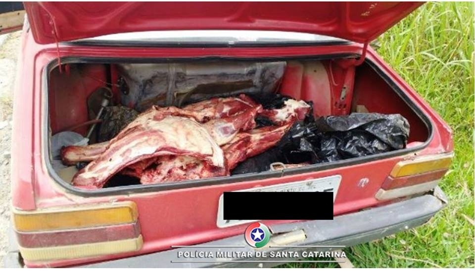 Quando os policiais procediam à revista veicular, encontram no porta-malas do carro partes do animal que havia sido abatido na noite anterior. O condutor do veículo, ao ser questionado sobre a procedência da carne, confessou que havia realizado o abatimento do animal na noite anterior, juntamente com outras pessoas.