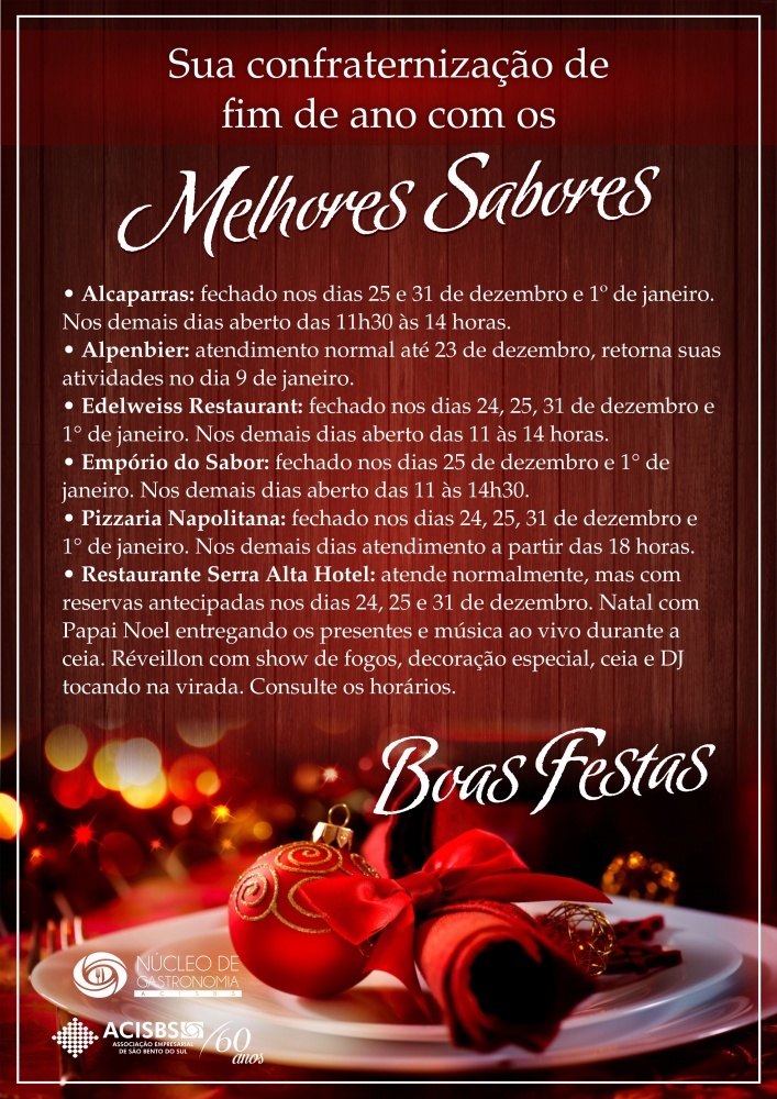 O Núcleo de Gastronomia da Associação Empresarial (Acisbs) divulga os horários de fim de ano dos estabelecimentos que integram o grupo. Eles informam o período que estarão fechados e o atendimento em datas especiais como natal e réveillon.