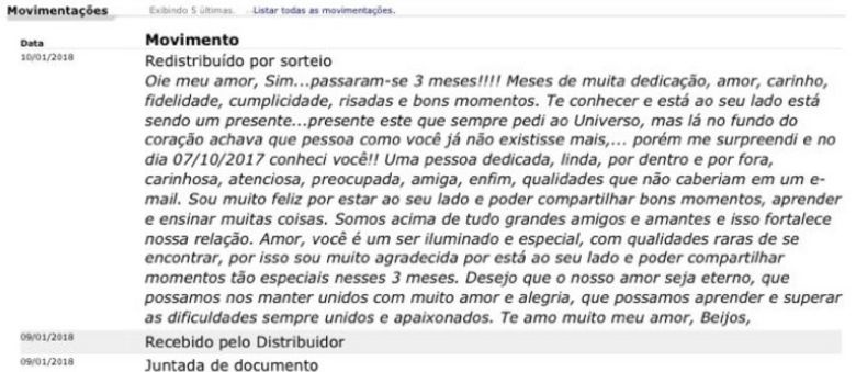 Ao publicar o despacho "Distribuído por sorteio", a pessoa responsável por abastecer o sistema colou um texto em que agradece os três meses de relacionamento com o seu amor. Até a manhã desta quinta-feira o texto segui no sistema, mas à tarde já havia sido retirado.