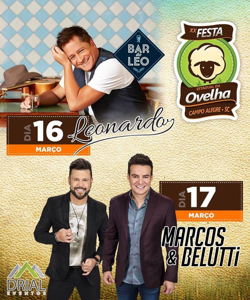 Os Shows Nacionais da dupla Marcos & Belutti e Leonardo já está confirmado como atrações principais da festa. O sertanejo Leonardo se apresenta na noite de abertura do evento, sexta-feira, dia 16 de março, e a dupla Marcos e Belutti, no sábado, dia 17 de março.