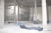 Terminada a retirada da camada antiga das paredes, do piso e das colunas, uma nova lavagem para retirada de poeira foi realizada e então iniciou-se a aplicação do novo impermeabilizante, que consiste em aplicação com spray do produto poliuretano elastômetro. Após a aplicação e secagem deste produto que forma uma espécie de camada plástica flexível e corrige todas as imperfeições da superfície, uma manta de tecido de fibra foi aplicado e, sobre esta manta uma segunda camada do poliuretano elastômetro.