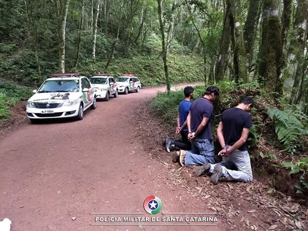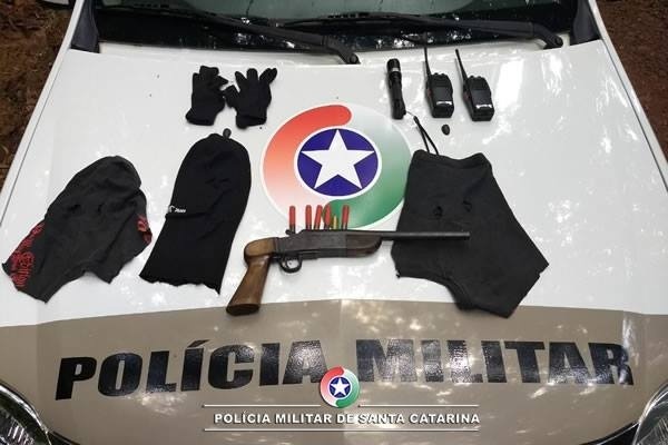 Durante a abordagem, foram localizados no interior do veículo uma espingarda adaptada, calibre .36, cinco munições calibre .36, uma munição calibre .45, três balaclavas, um par de luvas, lanterna e dois rádios-comunicadores.
