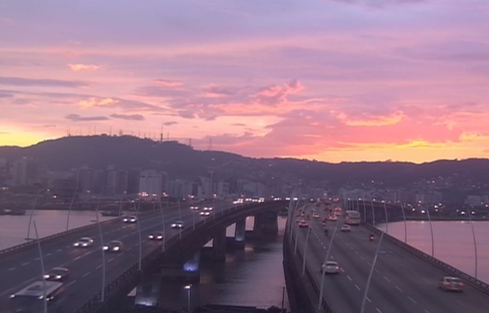 Céu colorido no início da manhã desta segunda-feira (19) em Florianópolis (Foto: Reprodução/ NSC TV)