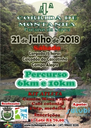 Estão abertas as inscrições para a 4ª Corrida de Montanha Paraíso da Serra, em Campo Alegre. A prova, que acontece no dia 21 de julho, sábado, tem opções de 5 e 10 km e terá a largada às 15 horas, no Calçadão da Cascatinha. As inscrições podem ser feitas até o dia 15 de julho.
