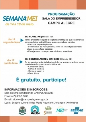 A Prefeitura e o Sebrae promovem, entre os dias 14 e 18, a Semana do Microempreendedor Individual (MEI). O evento é destinado para empreendedores e representantes de empresas ativas no município. As atividades gratuitas serão realizadas no Espaço Cultural Sirley Maria Neumann Johanson, no centro.