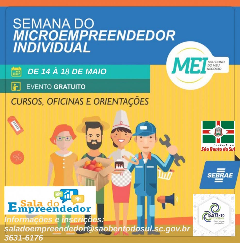 De 14 a 18 de maio ocorre em São Bento do Sul, a Semana do Microempreendedor Individual – MEI. O evento é promovido pela Secretaria de Desenvolvimento Econômico e Turismo, através da Sala do Empreendedor, e contará com oficinas, palestras e consultorias gratuitas a fim de orientar e capacitar os empresários, microempresários e empreendedores.