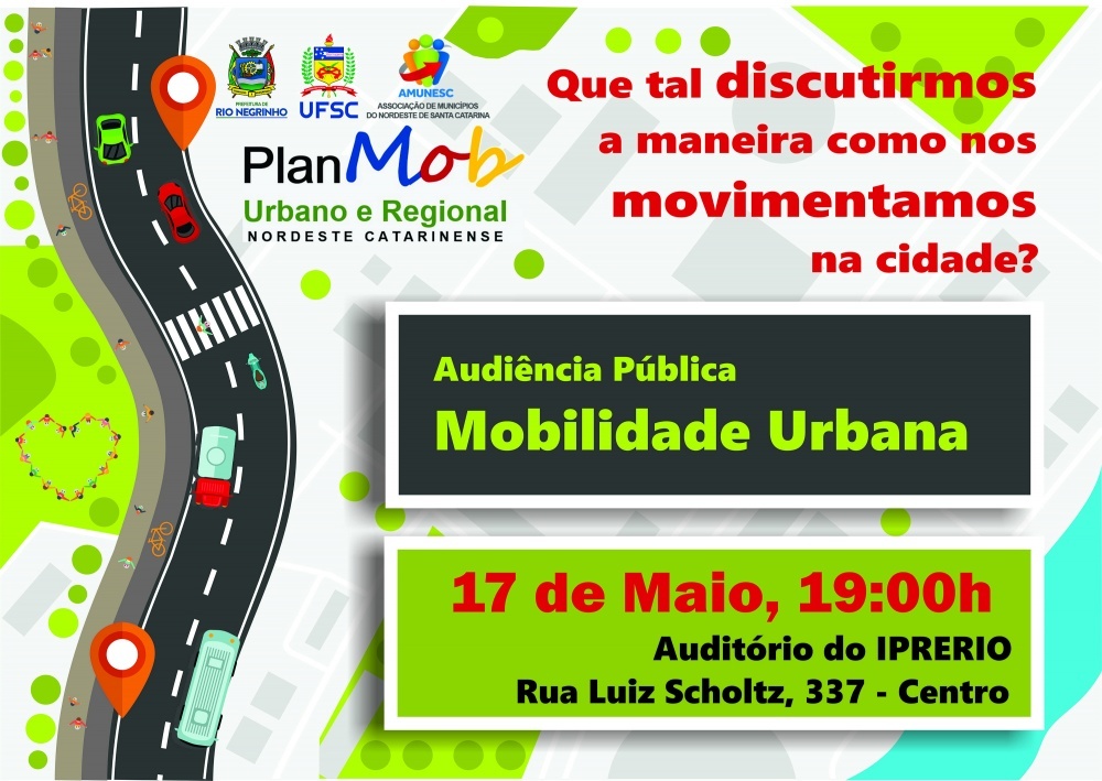 No dia 17 de maio , quinta-feira, às 19 horas no Auditório do Iprerio (ao lado da Acirne) acontecerá a 2ª Audiência Pública do Plano de Mobilidade Urbana e Regional - Planmob e toda a população rio-negrinhense é convidada a participar. O tema desta audiência é a consolidação de propostas para o Planmob.