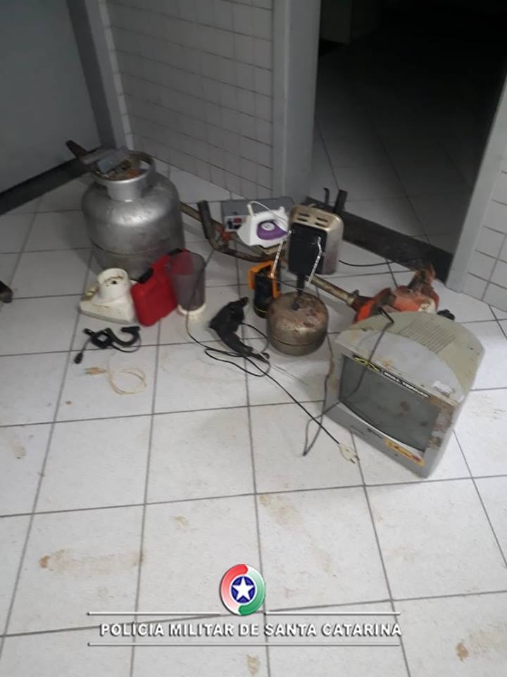 No veículo foram encontradas três femininas e na mata próxima ao local foi localizado um masculino. No interior do veículo foram constatados vários objetos de origem duvidosa e, após os policiais realizarem buscas no local, foram encontradas uma roçadeira e uma televisão 14 polegadas na mata onde o masculino estava escondido. Indagados sobre os objetos os suspeitos relataram que os objetos haviam sido furtados em uma chácara na localidade de Rio Natal, mas alegaram não saber o local exato. Diante dos fatos foi dada voz de prisão aos autores e os objetos foram apreendidos, sendo tomadas as demais medidas legais cabíveis.