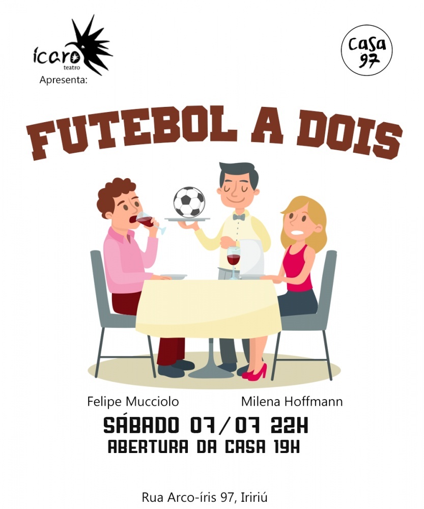 Sábado, 7 de julho, é o último dia para conferir a temporada de esquetes teatrais da Cia. Ícaro de Teatro preparadas com exclusividade para a Casa 97. Em montagem inédita, a peça “Futebol a Dois” tem, em cena, os atores Felipe Mucciolo e Milena Hoffmann. A intervenção artística ocorre por volta das 22 horas.
