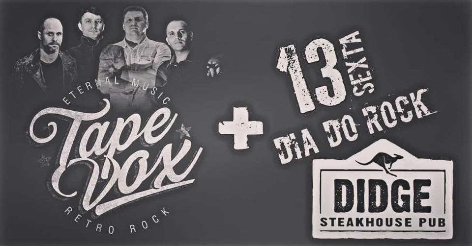 Nada de má sorte nesta sexta-feira, 13. A noite vai ser de muito agito no Didge Steakhouse Pub, de Balneário Camboriú, para comemorar o Dia Mundial do Rock em grande estilo. A galera roqueira vai poder cantar e dançar ao som das memoráveis músicas dos anos 50 aos 90, interpretadas pela banda Tape Vox. O show inicia às 23h e a entrada custa R$20. Quem for vestido a caráter ou com camiseta de rock ganhará uma Budweiser.