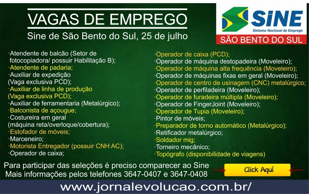 Atendente de balcão (Setor de fotocopiadora/ possuir Habilitação B); Atendente de padaria; Auxiliar de expedição (Vaga exclusiva PCD); Auxiliar de linha de produção (Vaga exclusiva PCD); Auxiliar de ferramentaria (Metalúrgico); Balconista de açougue; Costureira em geral (máquina reta/overloque/cobertura); Estofador de móveis; Marceneiro; Motorista Entregador (possuir CNH AC) Operador de caixa; Operador de caixa (PCD); Operador de máquina destopadeira (Moveleiro); Operador de máquina alta frequência (Moveleiro); Operador de máquinas fixas em geral (Moveleiro); Operador de centro de usinagem (CNC) metalúrgico; Operador de perfiladeira (Moveleiro); Operador de furadeira múltipla (Moveleiro); Operador de FingerJoint (Moveleiro); Operador de Tupia (Moveleiro); Pintor de móveis; Preparador de torno automático (Metalúrgico); Retificador metalúrgico; Soldador mig; Torneiro mecânico; Topógrafo (disponibilidade de viagens) e Vendedor de comércio varejista.