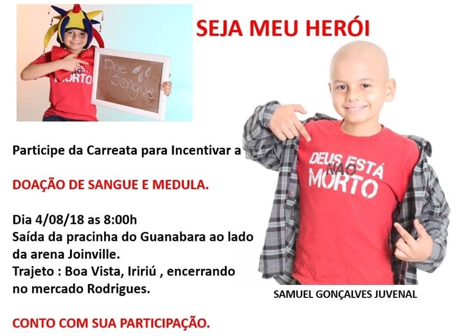 Ele aguarda na fila um doador compatível e por isso estaremos fazendo uma carreata para conscientizar e mostrar o quão importante é ser um doador,contamos com sua presença no dia 04/08/2018 (sábado) as 08:00h saida 08:30h encontro na PRAÇA DO GUANABARA (perto do jec), passando pelo bairro boa vista e iririu e encerrando em frente ao mercado Rodrigues.