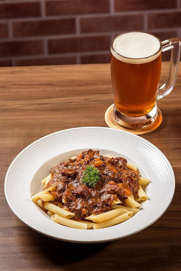 Nome do prato: penne ao molho de carne de panela - molho de carne de panela: carne cozida lentamente com cenoura, cebola, tomate, especiarias e ervas frescas harmonizada com chope ipa.
