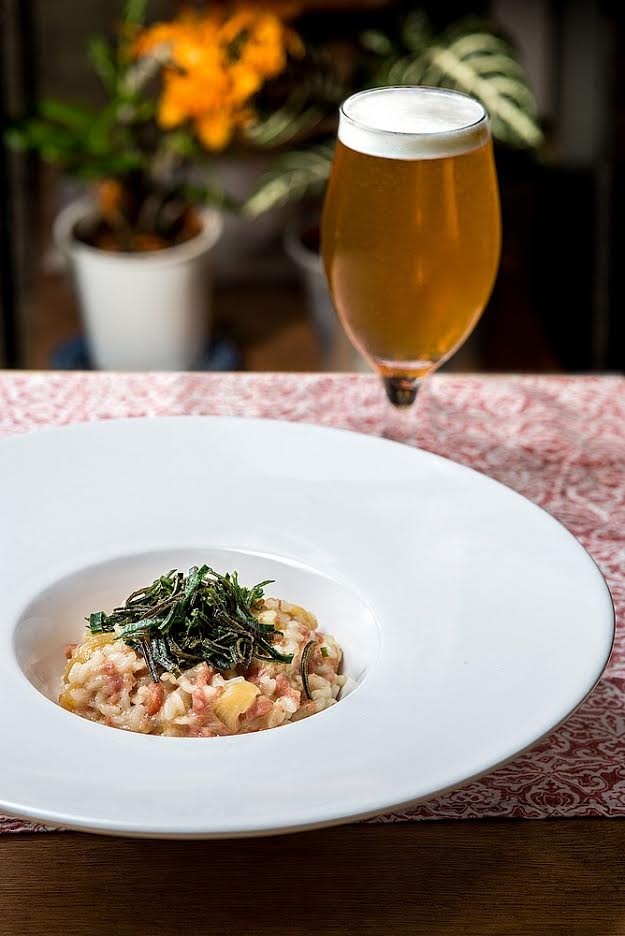 Nome do prato: risoto de linguiça Blumenau com crispy de alho poró