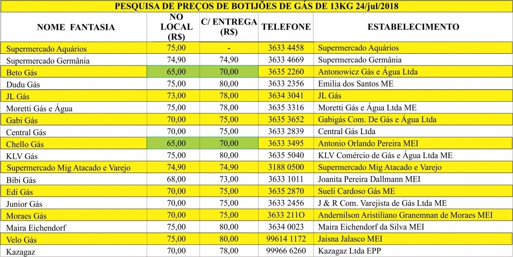 O Procon de São Bento do Sul realizou mais uma pesquisa de preços de gás de cozinha. A pesquisa foi realizada em 18 estabelecimentos comerciais.