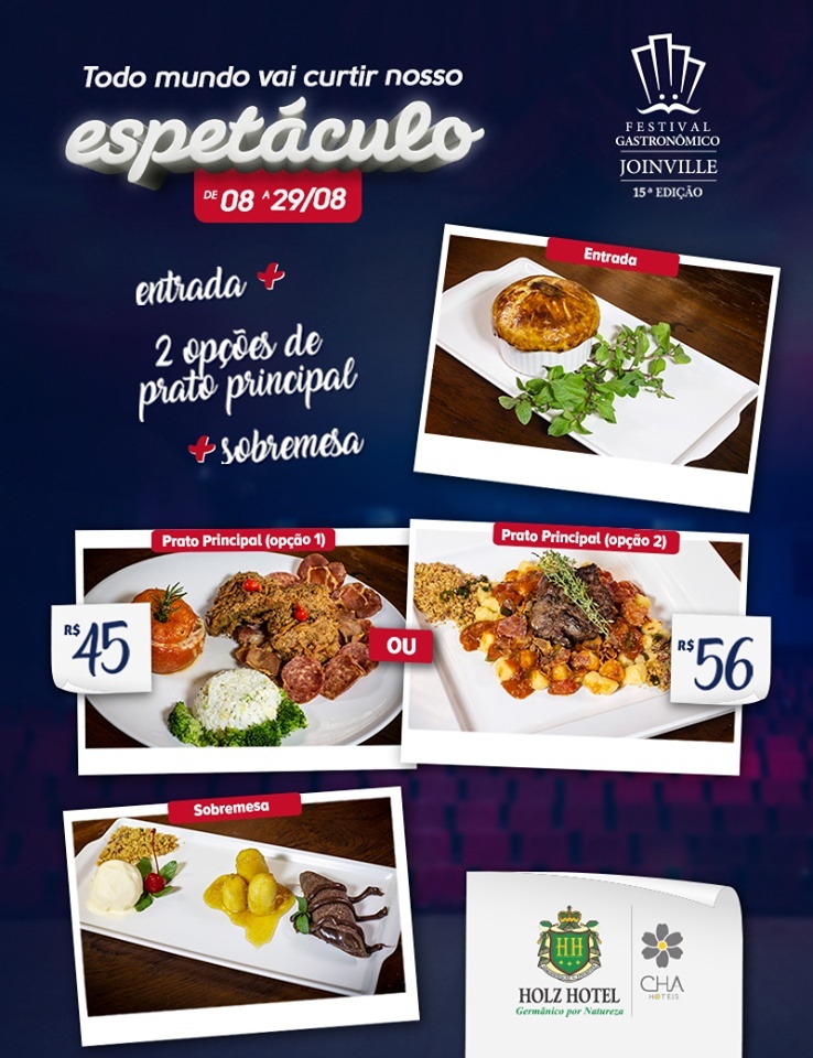 De 8 a 29 de agosto acontece em Joinville a 15ª edição do Festival Gastronômico com a participação de 20 restaurantes que oferecem pratos especialmente criados para o período. Um dos participantes é o restaurante do Holz Hotel, próximo a Expoville. Saiba mais em: www.holzhotel.com.br e no site: www.cdljoinville.com.br.