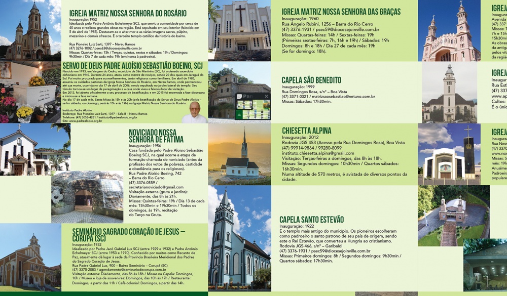 O Guia de Atrativos traz 30 edificações, espalhadas pelos bairros, elencadas através de critérios de relevância histórica, arquitetônica e de manifestações religiosas, de templos católicos e luteranos. Traz na capa a Chiesetta Alpina, e na parte interna, fotos com identificação, endereço e horários de celebrações dos templos. A tiragem inicial é de 20 mil impressões, com distribuição dirigida.