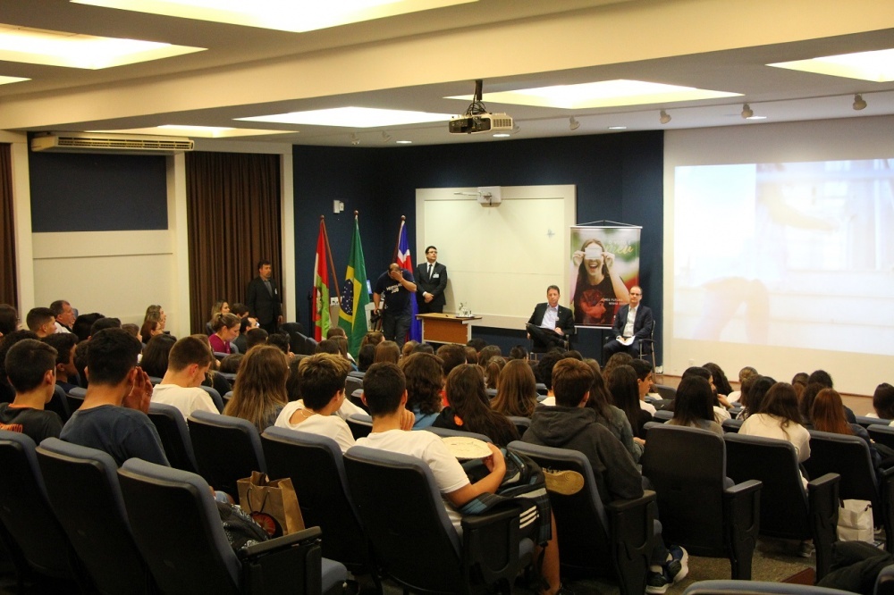 19.09.2018 Foi apresentada nesta terça-feira (18), no Colégio Catarinense de Florianópolis, a segunda fase da campanha “O Voto é Meu – Meu futuro, minha escolha”. Durante o evento, o presidente do TRE-SC, desembargador Ricardo Roesler, e o diretor da Escola Judiciária Eleitoral de SC, desembargador Antônio Zoldan da Veiga, conversaram com alunos de 16 e 17 anos sobre a importância da participação efetiva na política, por meio do voto.