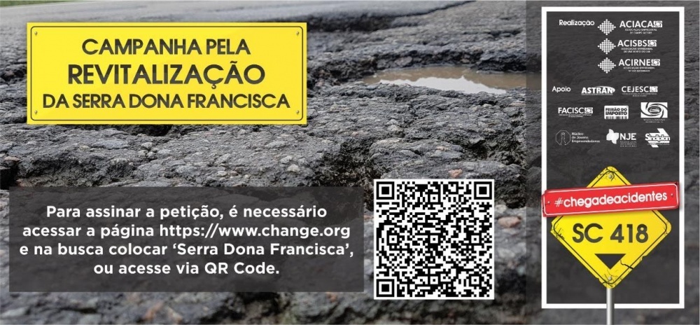Para quem não me conhece ainda, meu nome é Jonathan Roger Linzmeyer e sou de São Bento do Sul. Estou dedicando um tempo para pedir ajuda para você. Precisamos assinar e compartilhar o nosso abaixo-assinado pela SERRA DONA FRANCISCA. Como pessoa, empresário e também como presidente da Associação Empresarial de São Bento do Sul, humildemente eu peço que assine o abaixo assinado e compartilhe com os seus amigos e contatos. Vidas estão se perdendo quase que semanalmente na nossa serra e isso não apenas por imprudência, o estado e as condições da nossa rodovia SC 418 estão colaborando em muito com as mortes e acidentes.