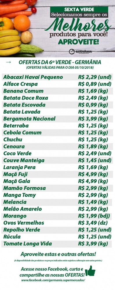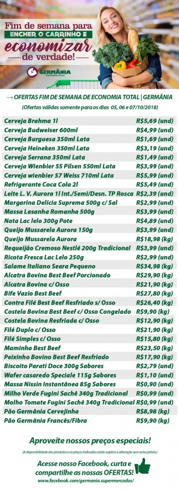 Ofertas do Germânia Supermercados para esta sexta, sábado e domingo, dias 05, 06 e 07/10/2018