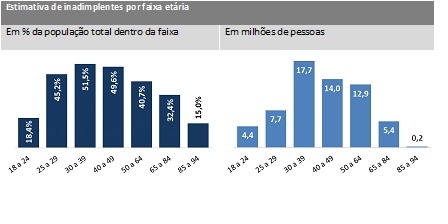 Considerando os brasileiros de 50 a 64 anos, a alta no número de negativados foi de 6,2%, com 12,9 milhões, e na população de 40 a 49 anos foi de 4,9%, com 14 milhões de inadimplentes.