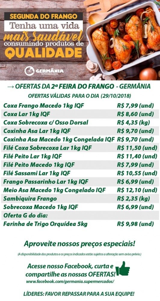 Ofertas Germânia Supermercados para esta segunda-feira do frango