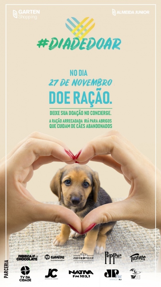 Conhecida internacionalmente a campanha #diadedoar chega ao Garten Shopping. Pessoas interessadas em fazer uma boa ação podem levar um pacote de ração e entregar no Concierge no dia 27 de novembro, dia oficial da campanha, e algumas instituições da cidade, que cuidam e direcionam animais para adoção responsável, serão beneficiadas. Além disso, comprando neste dia, determinados produtos, no Peppos Restaurante, Metroville, Giraffas, Tucanos ou Fabrica di Chocolate parte do valor arrecadado também será revertido para a causa animal.