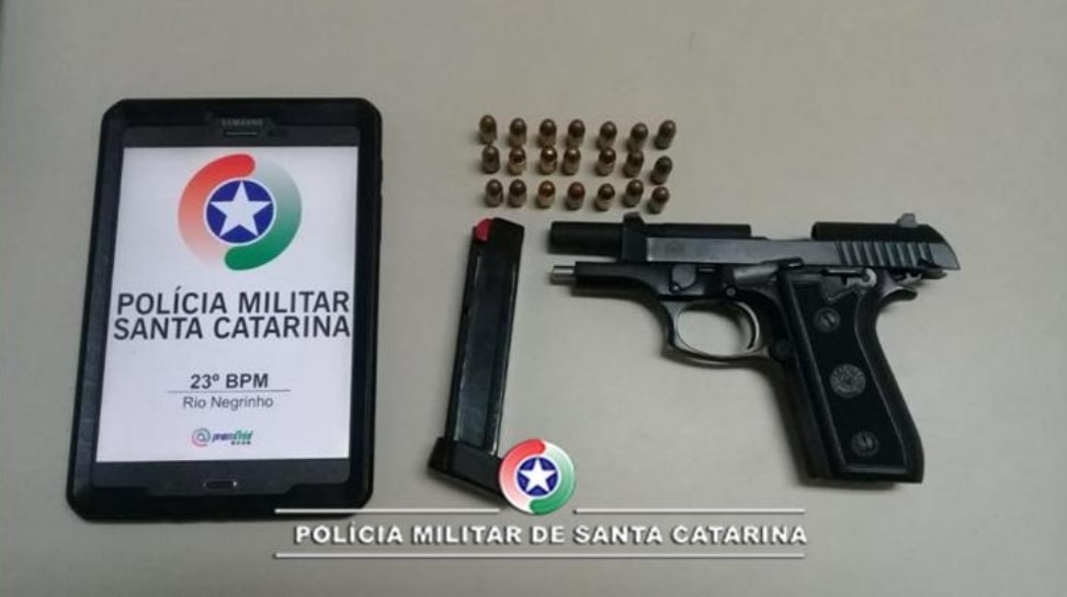 Diante da denúncia foi deslocada uma viatura ao local e durante a abordagem foi localizada uma arma de fogo.
