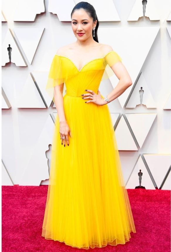 Constance Wu estava muito elegante em seu vestido amarelo com leve pliassado. “Acertou em cheio e é uma ótima inspiração para as mulheres da vida real”, afirma Luciana.