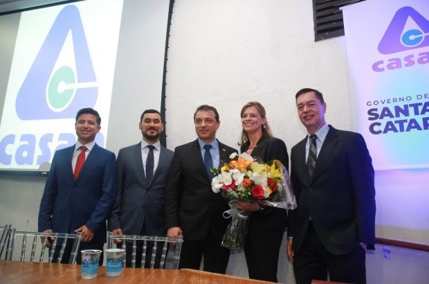 Funcionária concursada da Companhia Catarinense de Águas e Saneamento (Casan) desde 2004, a engenheira Renata Maas dos Anjos tomou posse na manhã desta segunda-feira, 25, como presidente da estatal. Ela lidera uma nova diretoria, toda formada por técnicos da empresa. No primeiro discurso à frente do cargo, Renata se comprometeu a estimular a cultura da inovação e da transparência em favor dos usuários dos serviços da Casan.