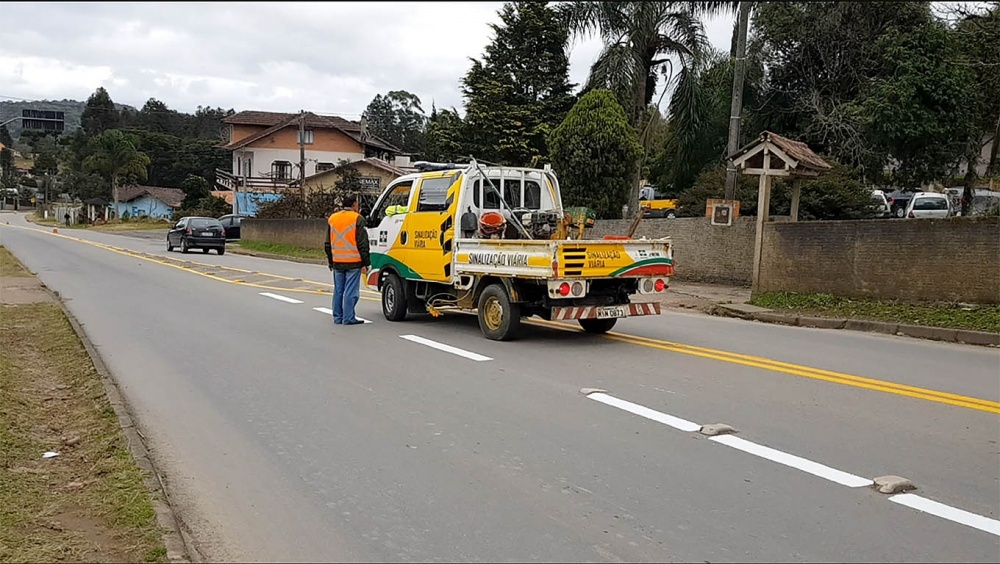 A equipe do Departamento de Trânsito Urbano – DETRU de São Bento do Sul está realizando a implantação de nova sinalização viária na rua Augusto Wunderwald, no bairro Centenário, em torno de 1 quilômetro de pintura. A via recentemente recebeu recape asfáltico e agora está sendo realizada a pintura de faixas, placas travessias elevadas.