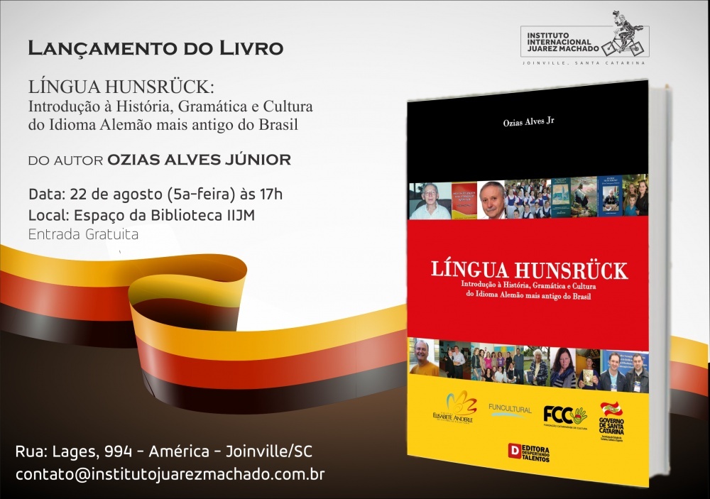 Você sabia que a língua Hunsrück, falada pelos descendentes alemães em diversas regiões de Santa Catarina, corre risco de extinção? Nesta quinta-feira (22), no Instituto Internacional Juarez Machado, em Joinville, no novo espaço do complexo cultural – a Biblioteca - será lançado o livro “Língua HUNSRÜCK: Introdução à História, Gramática e Cultura do Idioma Alemão mais antigo do Brasil” de autoria do jornalista e pesquisador catarinense Ozias Deodato Alves Júnior.