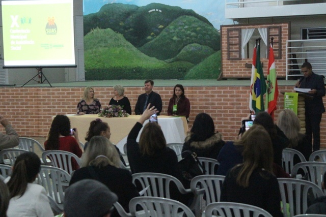 ABERTURA – Realização da Secretaria de Assistência Social e Habitação e do Conselho Municipal de Assistência Social (CMAS), a conferência iniciou na noite de terça-feira (27), com a cerimônia de abertura e a palestra magna do evento, reunindo cerca de 100 participantes. A solenidade reuniu na mesa de autoridades o vice-prefeito Udo Wagner – representando o prefeito Antídio Lunelli –, a secretária de Assistência Social e Habitação, Maria Santin Camello, a presidente do CMAS, Marcia Cardoso Garcia Teixeiras Tavares, e a representante dos usuários dos serviços da Assistência Social, Luciana Pereira.