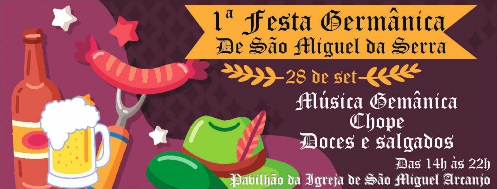 No próximo dia 28 de setembro, na tarde que antecede ao dia da festa tradicional da Igreja São Miguel Arcanjo, a comunidade de São Miguel da Serra realiza sua primeira Festa Tradicional Germânica. Como já é costume, o pavilhão da igreja se transforma num ponto de vendas das mais variadas produções culinárias da comunidade. 2019 é o ano em que se comemora o Centenário do Distrito e por isso a comissão organizadora das festividades pensou em incrementar transformando o dia em uma festa tradicional.