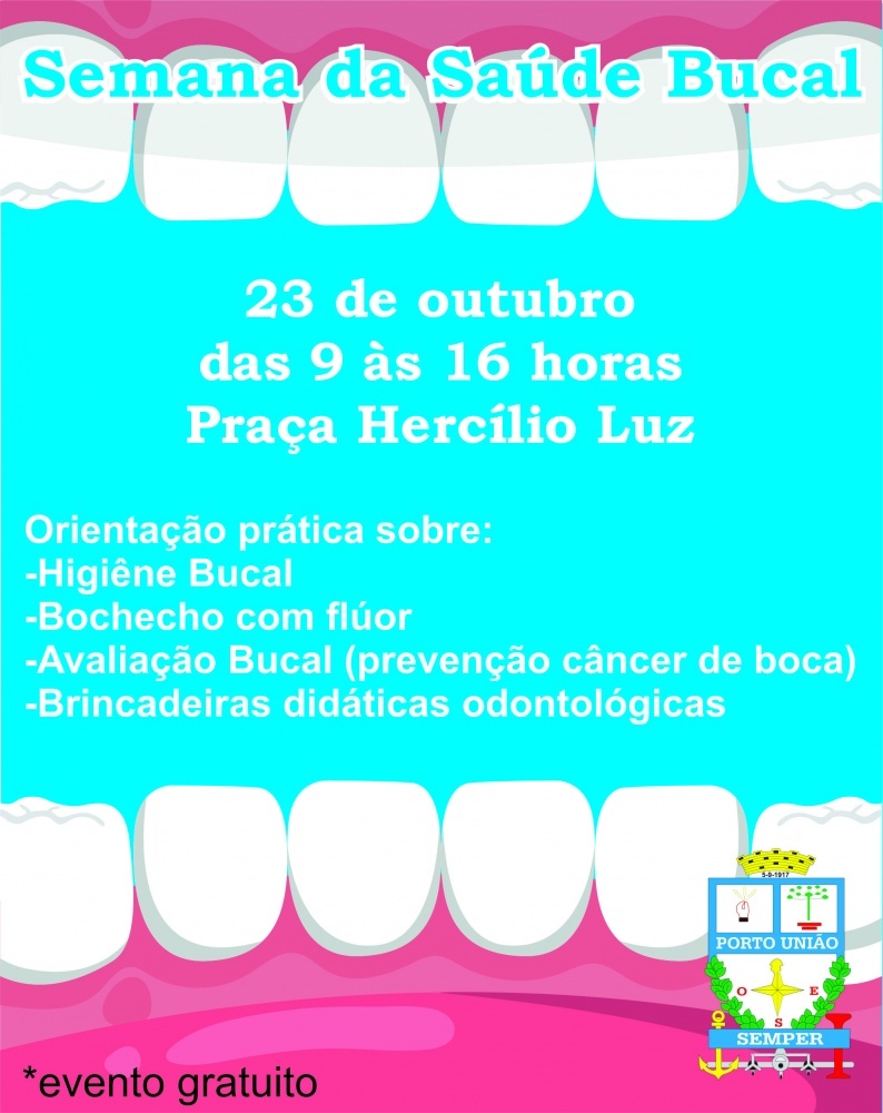 A Semana da Saúde Bucal é uma iniciativa da Secretaria Municipal de Saúde de Porto União aproveitando a data em que se comemora o Dia do Cirurgião Dentista, 25 de outubro. Durante os dias compreendidos entre 22 e 24 de outubro os profissionais da área odontológica passarão por capacitações visando a melhoria nos atendimentos das Unidades Básicas de Saúde pelos usuários do SUS.